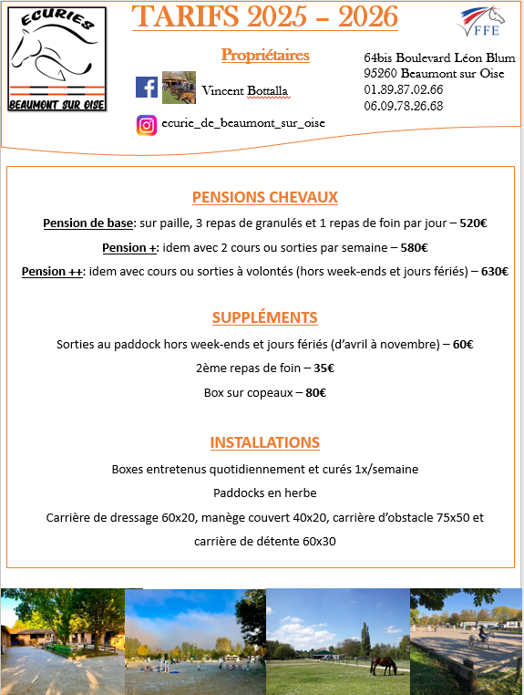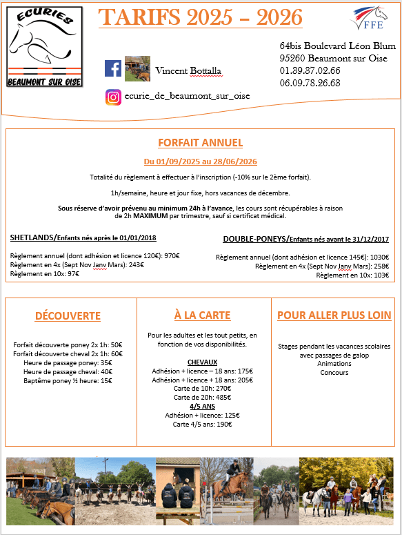 Nous vous proposons diverses formules de la découverte de l’équitation jusqu’à la pratique de la compétition. Sur justificatif de domicile, les habitants de la ville de Beaumont bénéficient d’un tarif préférentiel.